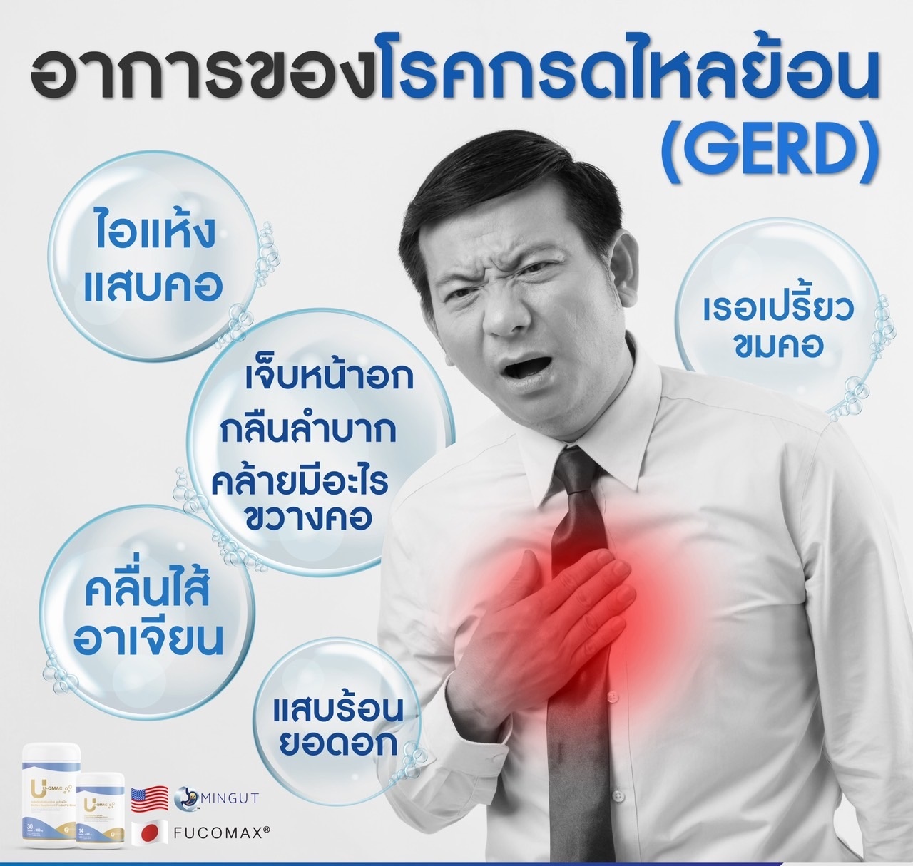 สั่งซื้ออาหารเสริมกดแอดไลน์เพื่อรับสิทธิ์ ส่งฟรี รู้สึกแสบร้อนกลางอก เรอเปรี้ยว และคลื่นไส้ รู้สึกจุกเสียดแน่นบริเวณใต้ลิ้นปี่ และรู้สึกเหมือนมีอะไรติดคออยู่ตลอดเวลา มีน้ำรสเปรี้ยว